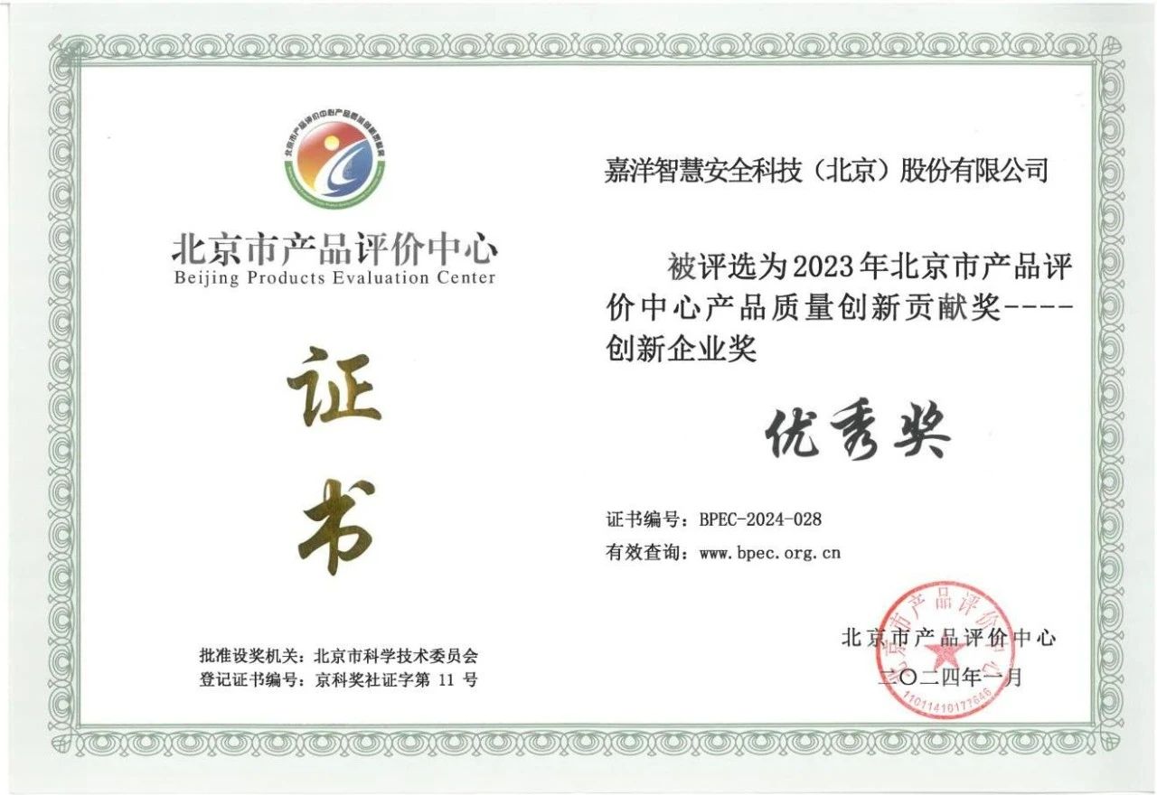 2024年1月15日,北京市产品评价中心发布了《关于表彰2023年北京市产品评价中心产品质量创新贡献奖的决定》的通知,嘉洋智慧安全科技(北京)股份有限公司(下称“嘉洋科技”)荣获产品质量创新成果二等奖和产品质量创新优秀企业奖。这一荣誉不仅是对我司长期致力于产品质量创新的专业认可,更是对未来发展的极大鼓舞。